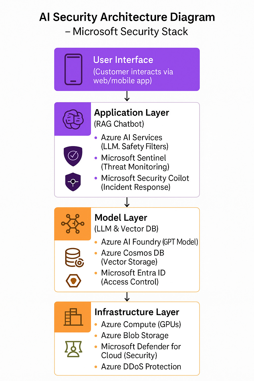 Infrastructure Layer: Azure compute and storage are protected by Defender for Cloud and DDoS Protection.